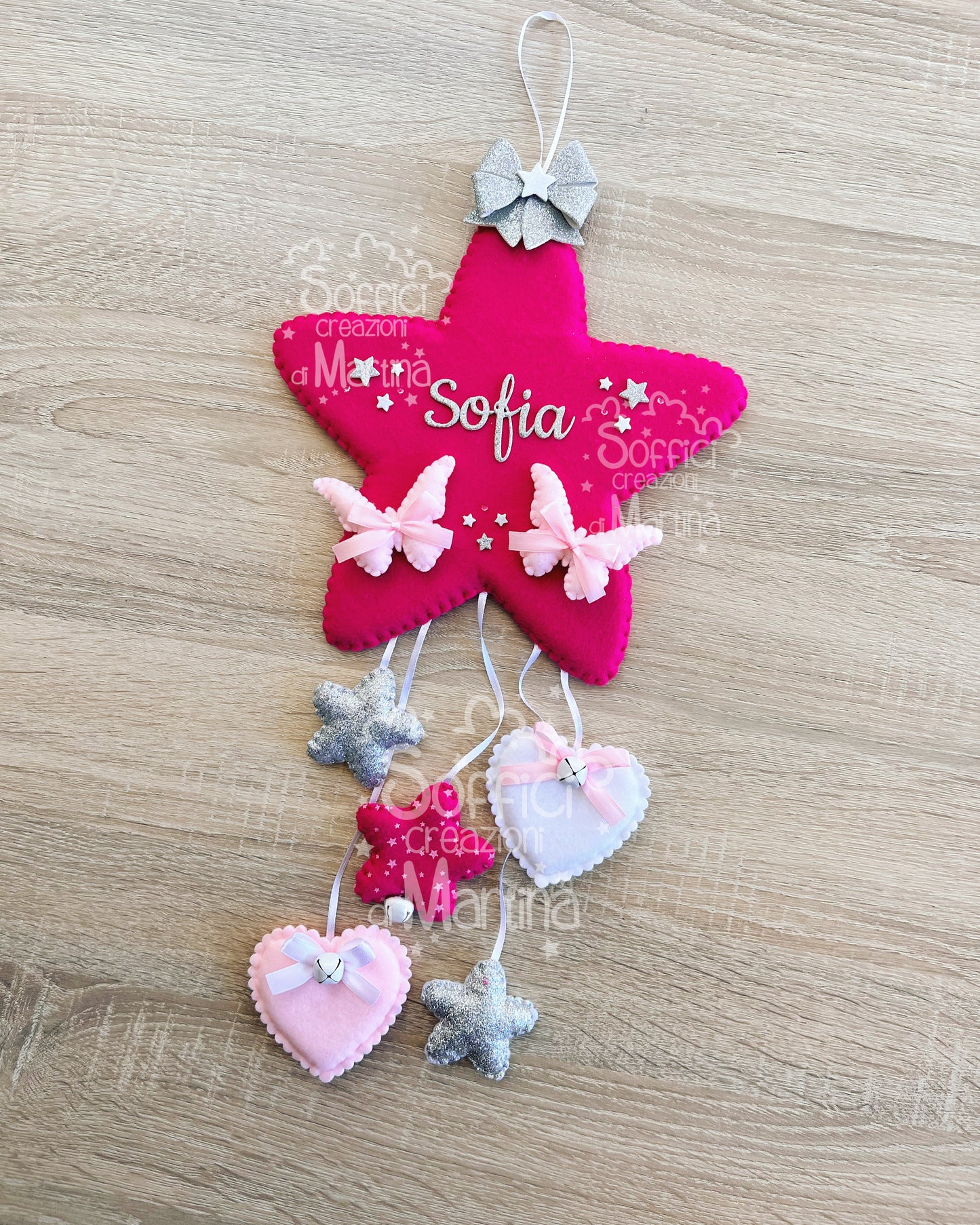 This brightly colored star (but which you can change according to your preferences) is perfect for those who love glitter, hearts and butterflies, and is enriched with glittery bells and stars!