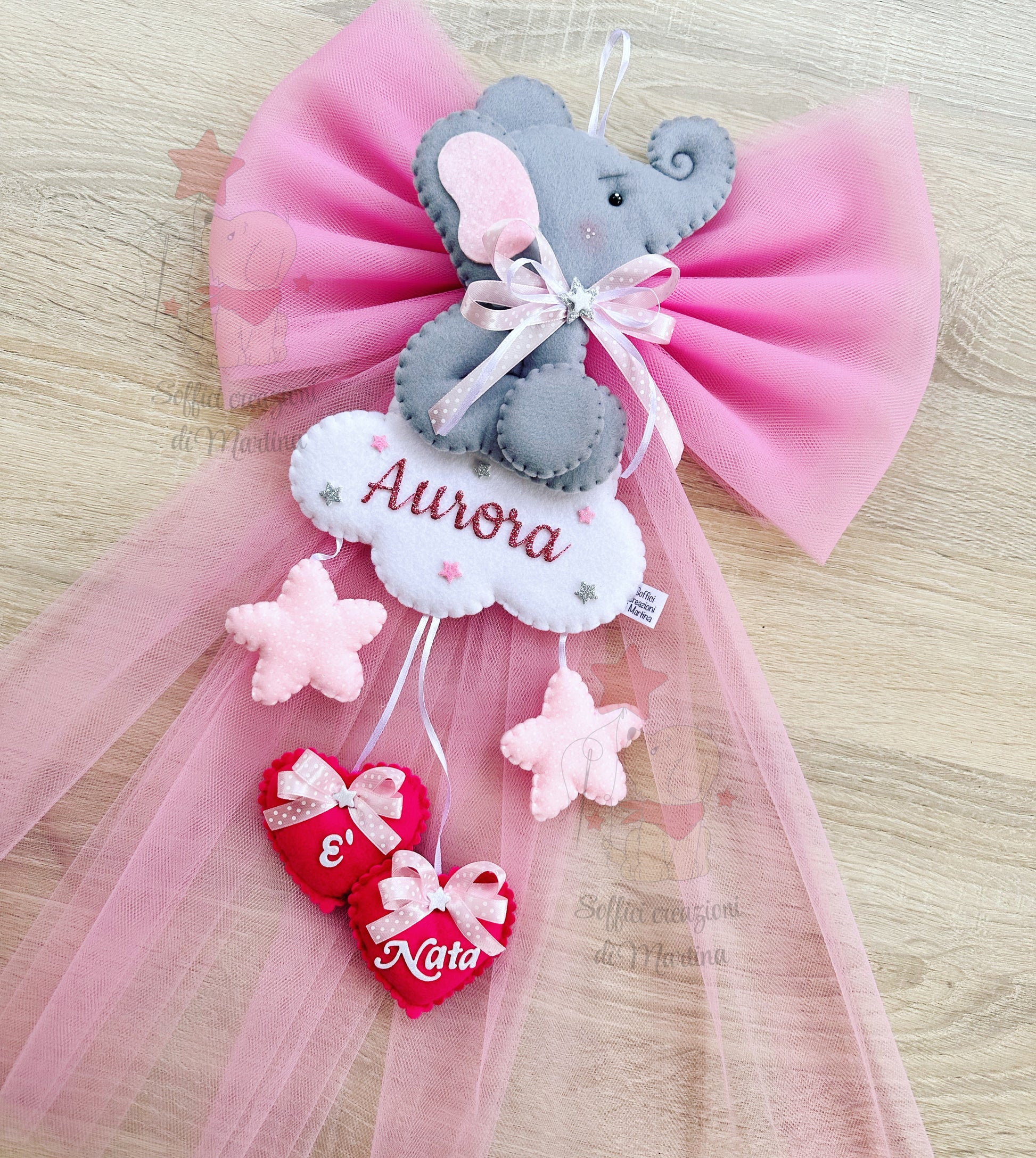 This birth bow is made up of a very sweet little elephant sitting on a soft cloud, it is enriched with hanging hearts and stars where it is possible to insert the writing "she was born" and finally tulle is added to complete it and give a touch of elegance.