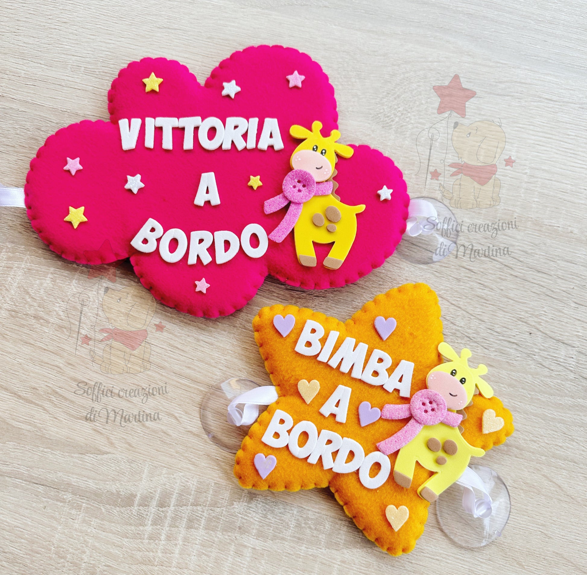 In formato stellina o nuvoletta, disponibile con tantissimi animaletti e colori diversi! Scrivimi per scegliere il tuo bimbo a bordo!