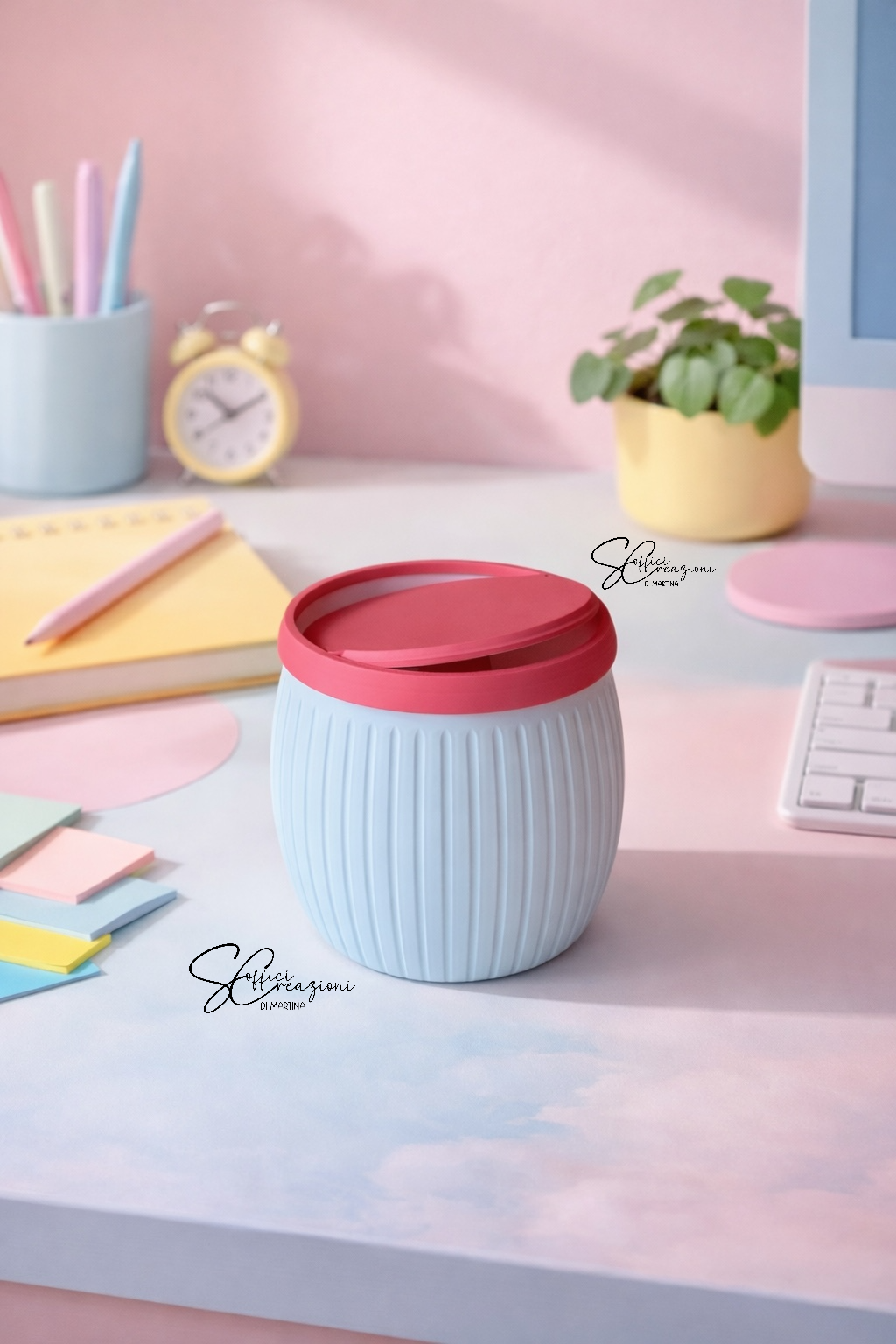 Il design moderno con superficie rigata, unito alla combinazione azzurro pastello e coperchio rosa, lo rende un elemento decorativo raffinato, ideale per ufficio, cameretta, studio o home office. Grazie alle dimensioni ridotte, si integra facilmente anche in postazioni minimal o su scrivanie di piccole dimensioni.