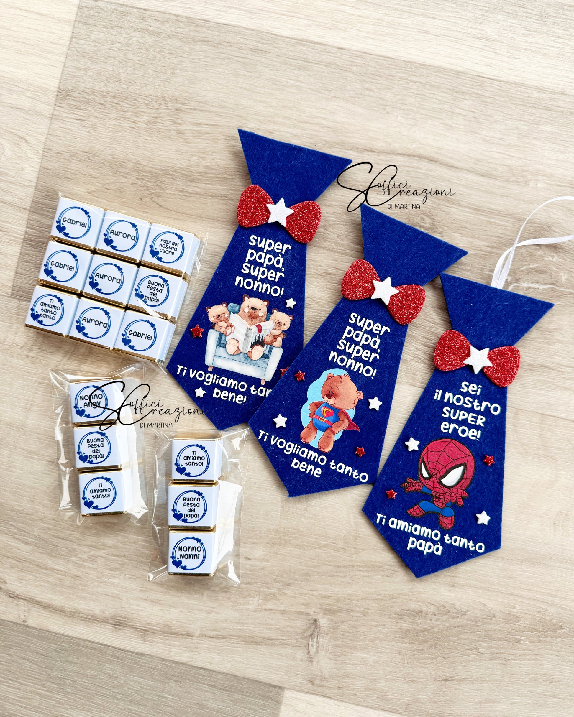 La cravatta per la festa del papà è sempre, anno dopo anno, fra i regalini più scelti! Disponibile in vari colori, con la frase personalizzata ed anche il personaggio!