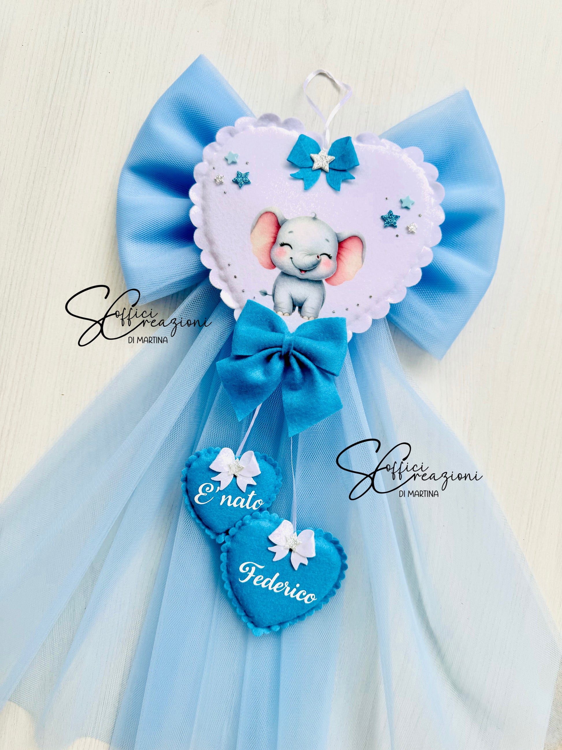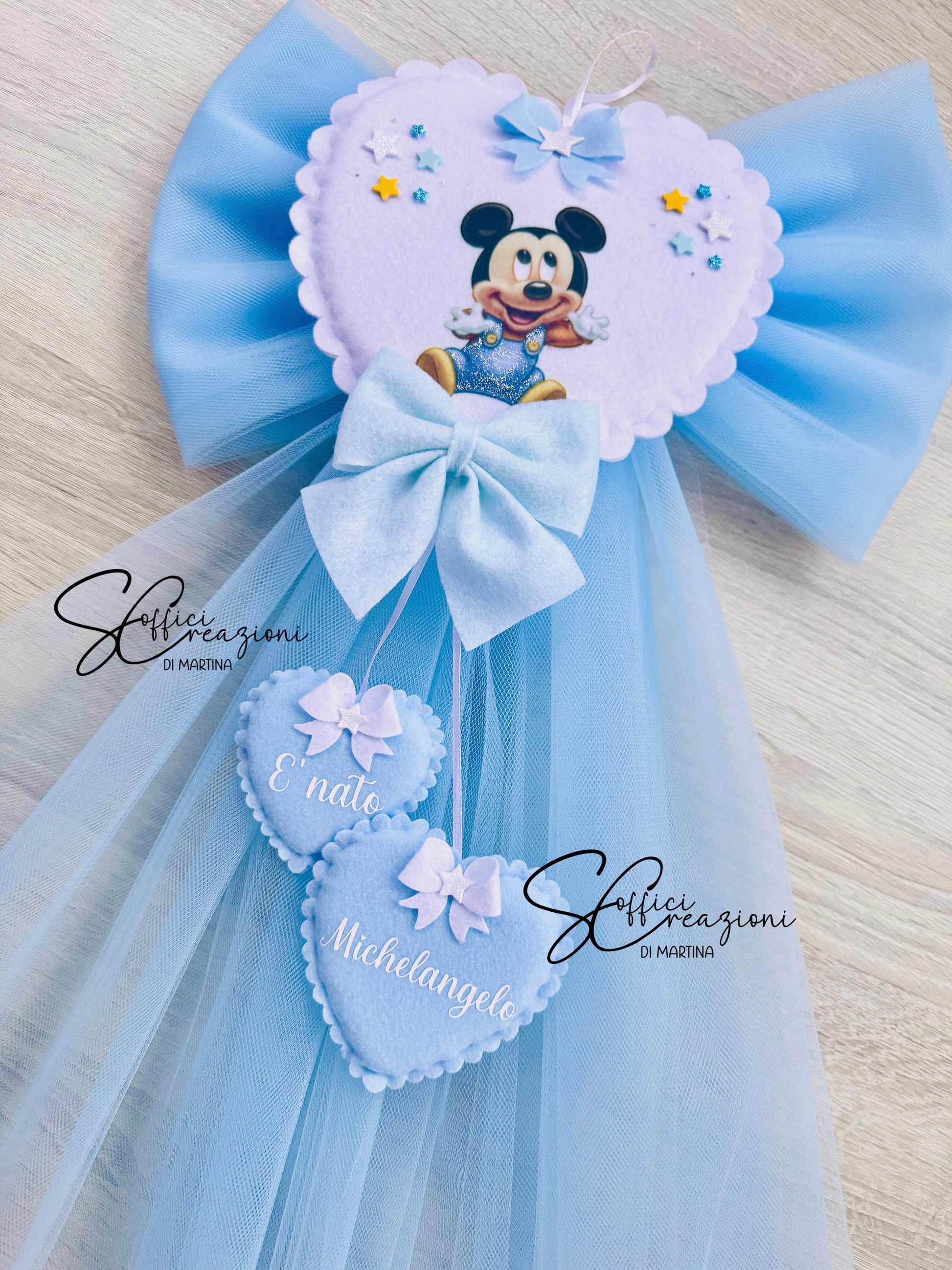 Questo modello di fiocco può fare al caso tuo se vuoi personalizzarlo con personaggi Disney o immagini particolari ( ce ne sono di bellissime!! Contattami per vederle tutte!), è composto da un due cuori di due dimensioni con possibilità di scegliere i colori e l’aggiunta del tulle ed ovviamente del nome.