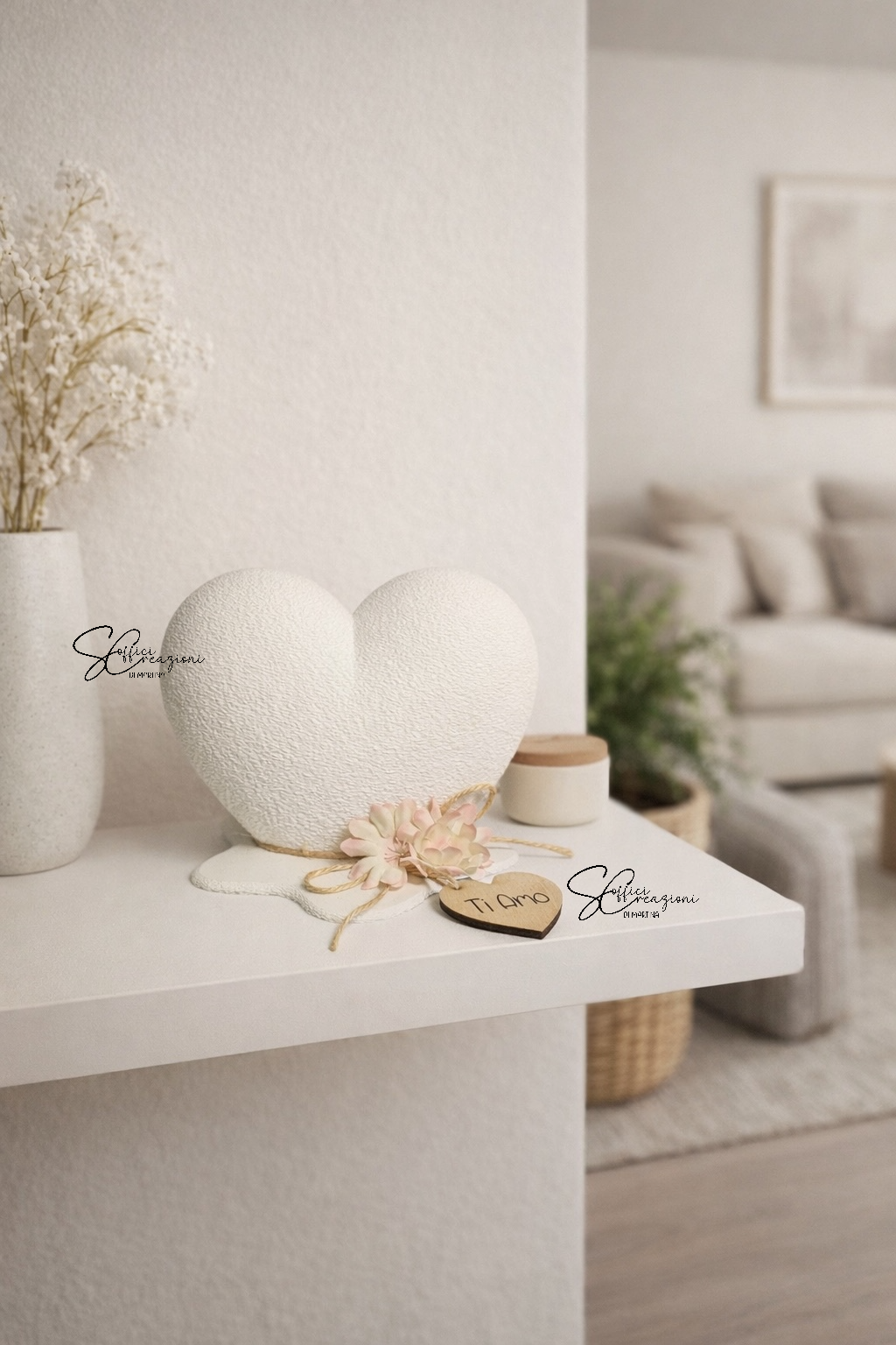 Realizzata con una superficie materica in stampa 3D, è arricchita da un fiore decorativo, uno spago naturale e una targhetta in legno “Ti Amo”, dettagli che la rendono un’idea regalo originale per San Valentino, anniversari, fidanzamenti o come pensiero romantico per la casa. ( disponibile anche con nome)