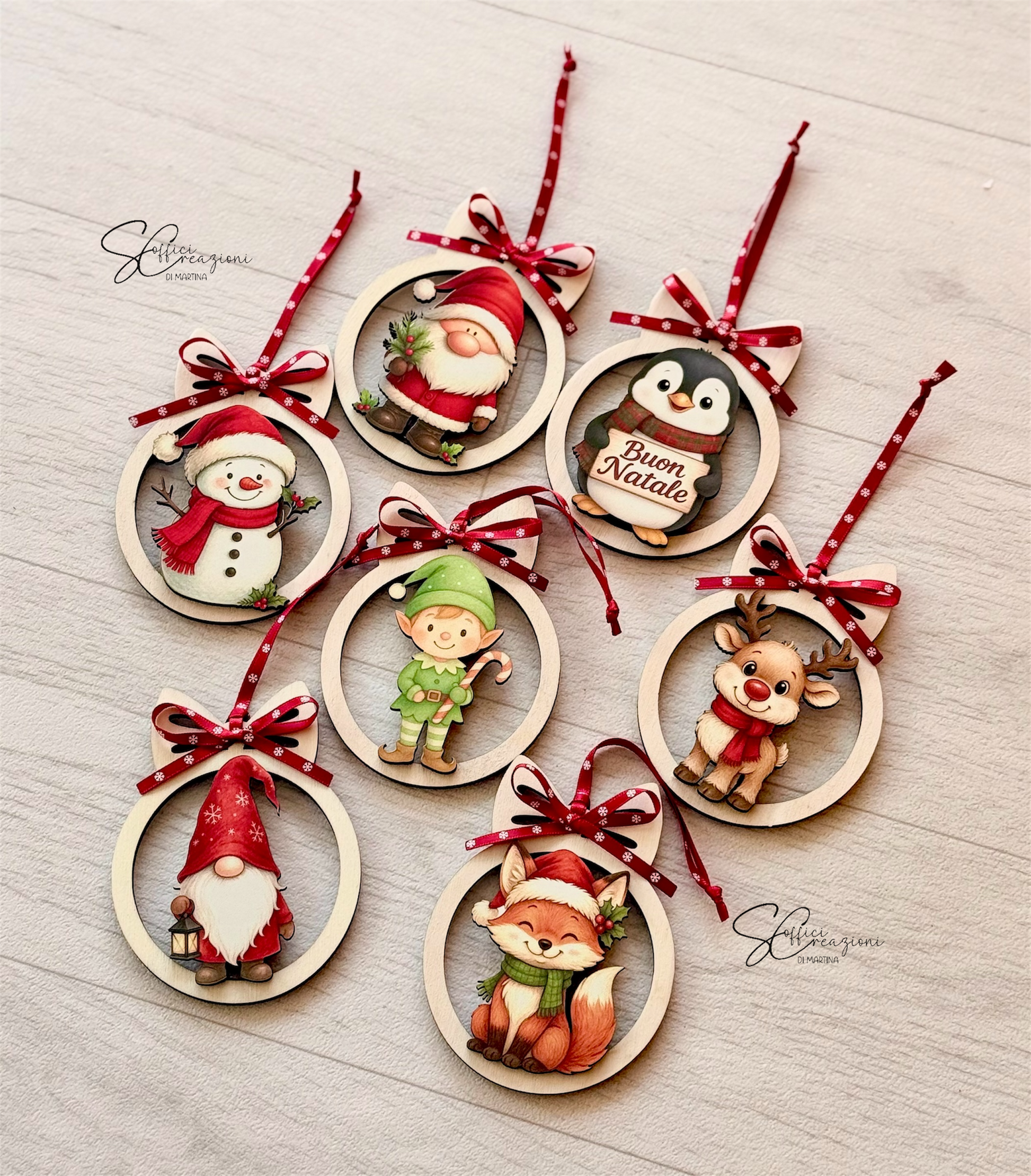 Una pallina natalizia in legno disponibile con personaggi a scelta tra quelli proposti, misura 8/10 cm, perfetto anche come segnaposto natalizio.