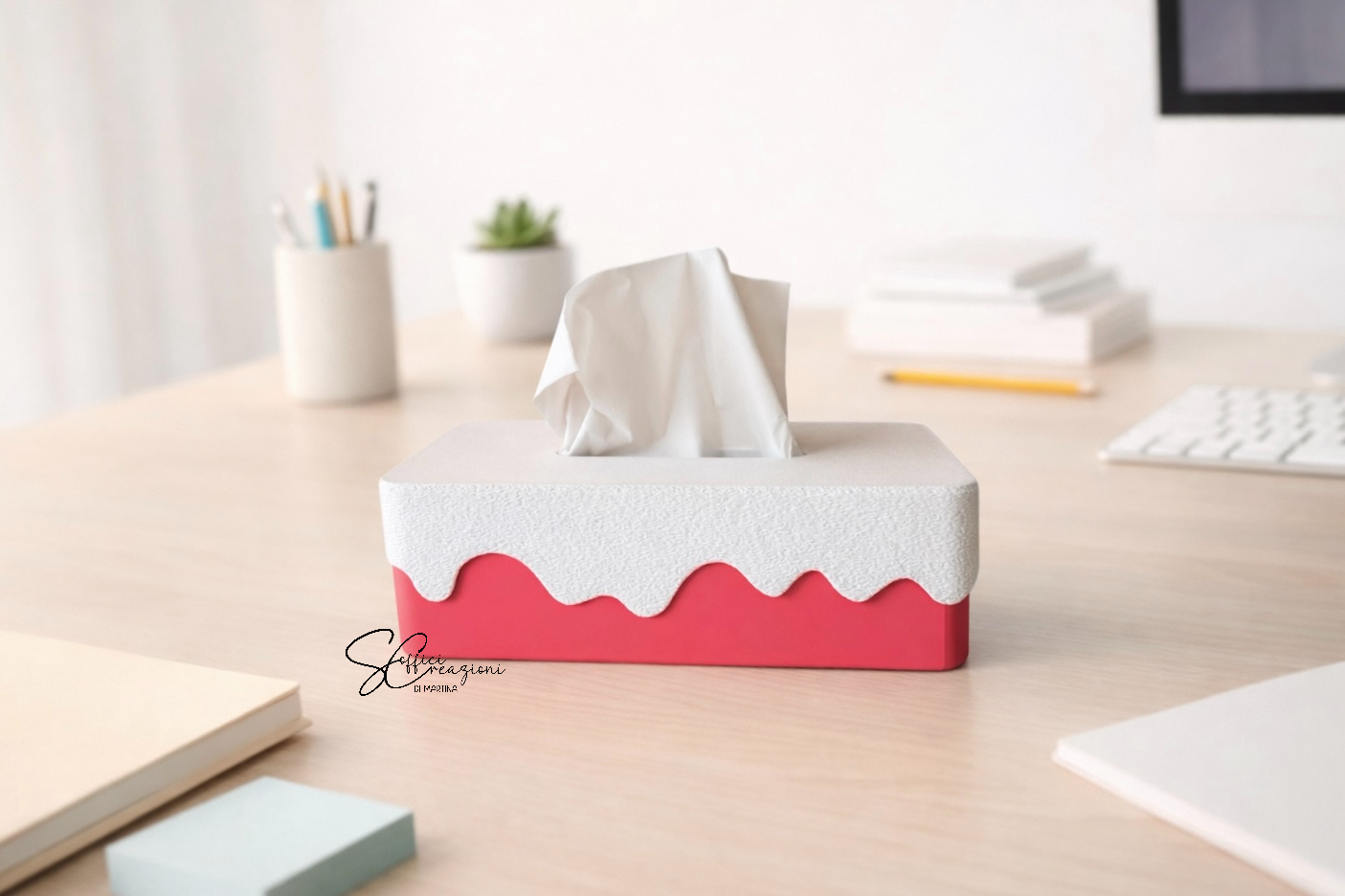 Aggiungi un tocco di stile alla tua scrivania o alla tua casa con questo elegante porta fazzoletti dal design moderno. La base rosa vivace si unisce al top bianco testurizzato, creando un effetto estetico unico che ricorda una colata morbida e decorativa. Realizzato con materiali resistenti, è perfetto per organizzare i fazzoletti in modo pratico e igienico, mantenendo l’ambiente ordinato. Ideale per uffici, camerette, soggiorni e spazi creativi. Un accessorio funzionale che diventa anche un elemento d’arredo.