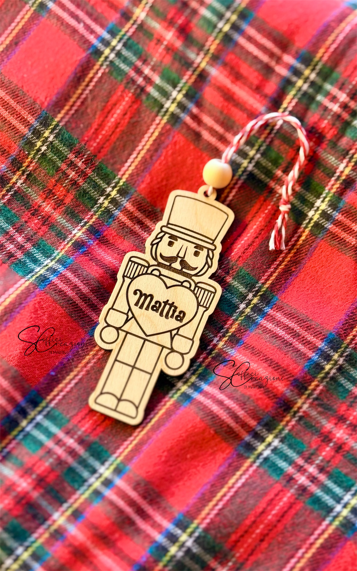 Porta la magia del Natale sul tuo albero con il nostro schiaccianoci in legno inciso a laser, personalizzabile con il nome che preferisci. Realizzato in legno naturale di alta qualità, questo elegante addobbo natalizio unisce tradizione e artigianalità, perfetto come idea regalo o come tocco speciale per la tua casa.